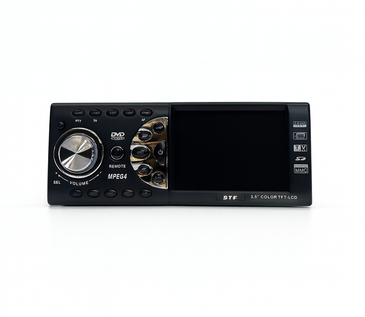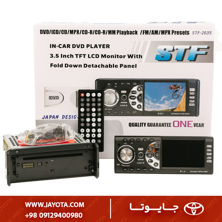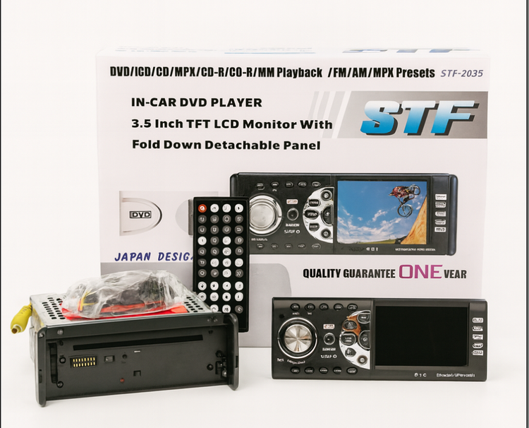 ضبط یا پخش خودرو STF از نوع Multi‑Media Head Unit DVD Player بوده و قابلیت اجرای طیف کامل فرمتهای رسانهای شامل DVD، VCD، CD، MP3، MP4، MPEG4، CD‑R و CD‑RW را دارد.