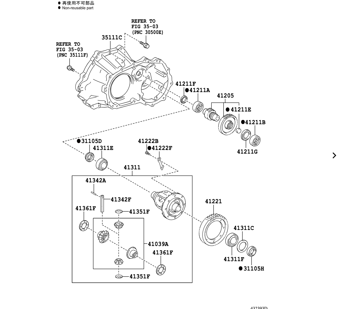 - نوع سیستم: مخصوص گیربکسهای دستی (Manual Transaxle) سری C تویوتا (مانند C50 یا C54). در این سیستم، شفت خروجی دوم گیربکس نقش پینیون را بازی میکند و کرانویل روی هوزینگ دیفرانسیل سوار میشود.