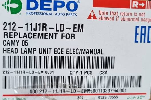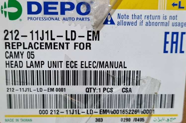 برند DEPO تایوان این محصول را با کد سری 212-11J1 تولید کرده است. تفاوت اصلی این چراغ با مدلهای ۲۰۰۲-۲۰۰۴ در طراحی داخلی شفافتر، لنز (عدسی) بزرگتر و گرافیک داخلی بهروزتر است. عبارت “REPLACEMENT FOR CAMY 05” روی لیبل جعبه، سازگاری دقیق آن را با مدلهای ۲۰۰۵ به بالا تایید میکند. این چراغها دارای پوشش محافظ UV هستند که از مات شدن طلق در برابر آفتاب شدید جلوگیری میکند.