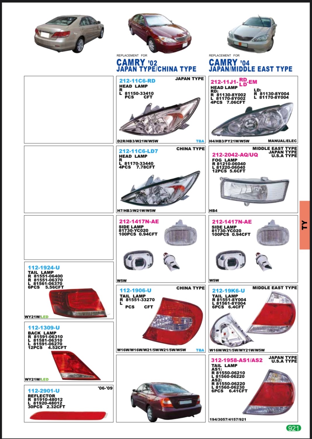 این محصول چراغ جلوی تویوتا کمری اتاق XV30 (نسل پنجم) مخصوص مدلهای فیسلیفت شده سالهای ۲۰۰۵ و ۲۰۰۶ است که در بازار ایران به نام “کمری گرند” شناخته میشود.