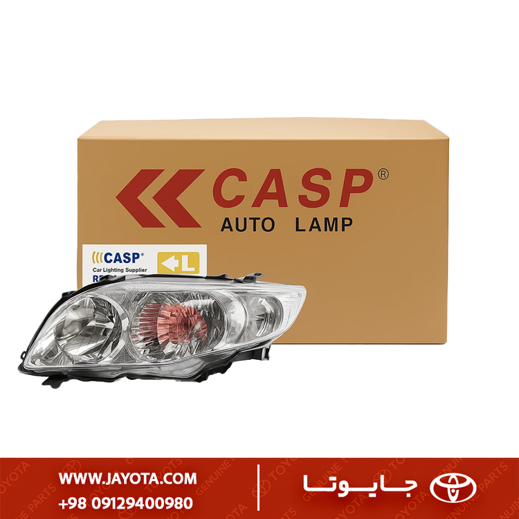 چراغ جلو کرولا ۲۰۰۸ CASP دارای ساختار رفلکتوری دوگانه (Dual Halogen Beam) و لنز پلیکربنات شفاف با پوشش Anti‑UV میباشد.