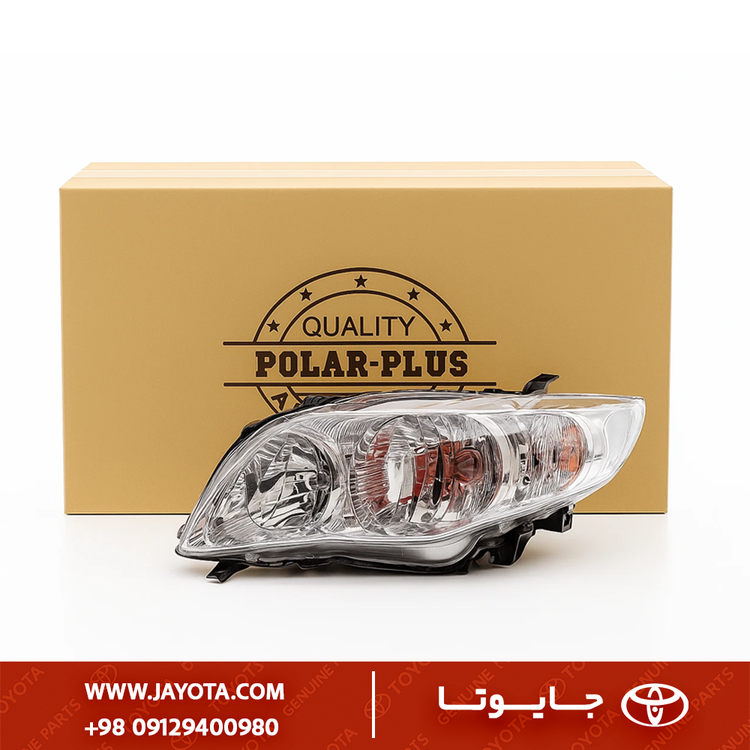 چراغ جلو چپ کرولا ۲۰۰۸ POLAR دارای طراحی رفلکتوری دو بخش (High / Low Beam) بوده و با لنز پلیکربنات شفاف و پوشش Anti‑UV در مقابل کدر شدن و تابش خورشید مقاوم است.