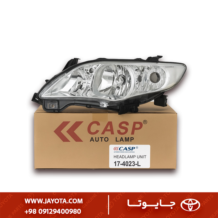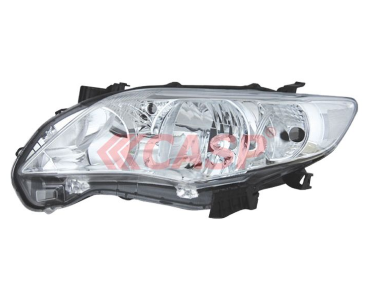 چراغ جلو کرولا ۲۰۱۱ CASP از نوع Dual Halogen Reflector است و با لنز پلیکربنات شفاف (PC Anti‑UV) و بازتابندهی کروم پوش تولید میشود.