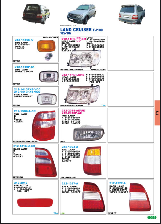 | Toyota Land Cruiser 100 | FZJ100, UZJ100 | 2006 - 2007 | Liftgate | ناسازگار. مدلهای ۲۰۰۶ به بعد دارای چراغ LED با طراحی کاملاً متفاوت هستند. |